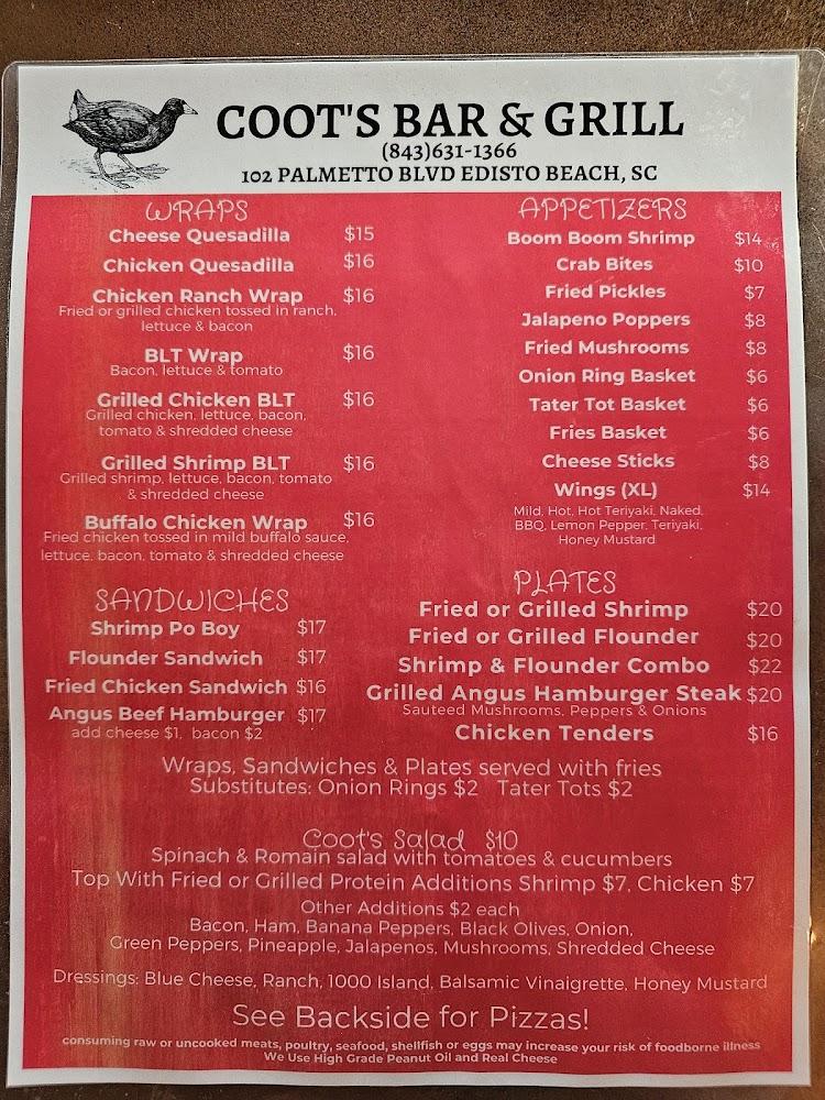 Welcome to Coot’s Bar & Grill, your go-to spot on Edisto Island for a delectable dining experience! Located at 102 Palmetto Blvd, we offer a vibrant atmosphere featuring outdoor seating, live concerts, and karaoke nights. Enjoy our extensive menu, showcasing local specialties and a wide range of cocktails, beers, and wines, all at wallet-friendly prices. Whether you’re looking for a quick bite, a leisurely lunch, or a fun dinner out, Coot’s has something for everyone. With convenient takeout, delivery options, and accessibility features, you’ll find the perfect blend of relaxation and enjoyment at Coot’s Bar & Grill.